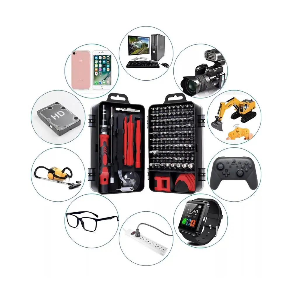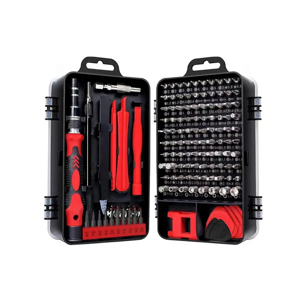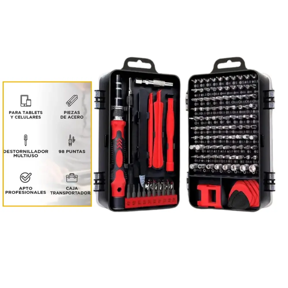 Kit Herramientas Precision 115 En 1 Celulares Pro' es un set de precisión diseñado de manera profesional y práctica. Su aspecto es hermoso y es fácil de llevar. Los mangos están diseñados de acuerdo con la forma de la mano de la mecánica del cuerpo humano y agregan una tapa trasera en espiral para que la operación sea más cómoda y ahorre mano de obra. Los lotes de trajes están diversificados, adecuados para el desmontaje de varios artículos, confiables y duraderos.