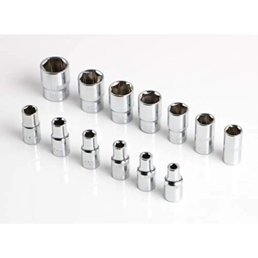 Juego de llaves de vaso de 46 piezas para reparaciones de automóviles y bricolaje: conjunto completo de 46 piezas para reparaciones automotrices, mantenimiento y proyectos de bricolaje. Alto torque, los enchufes de 6 puntos agarran los lados planos de los sujetadores, no las esquinas, evitando el redondeo.